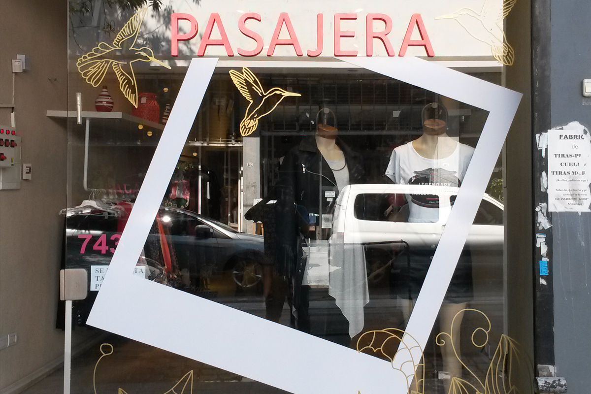 Decoracion en vinilo de corte de Vidriera "Pasajera" el trabajo se realizo en vinilo negro, blanco y dorado de corte en plotter graphtec FC8000 de 135 cm.