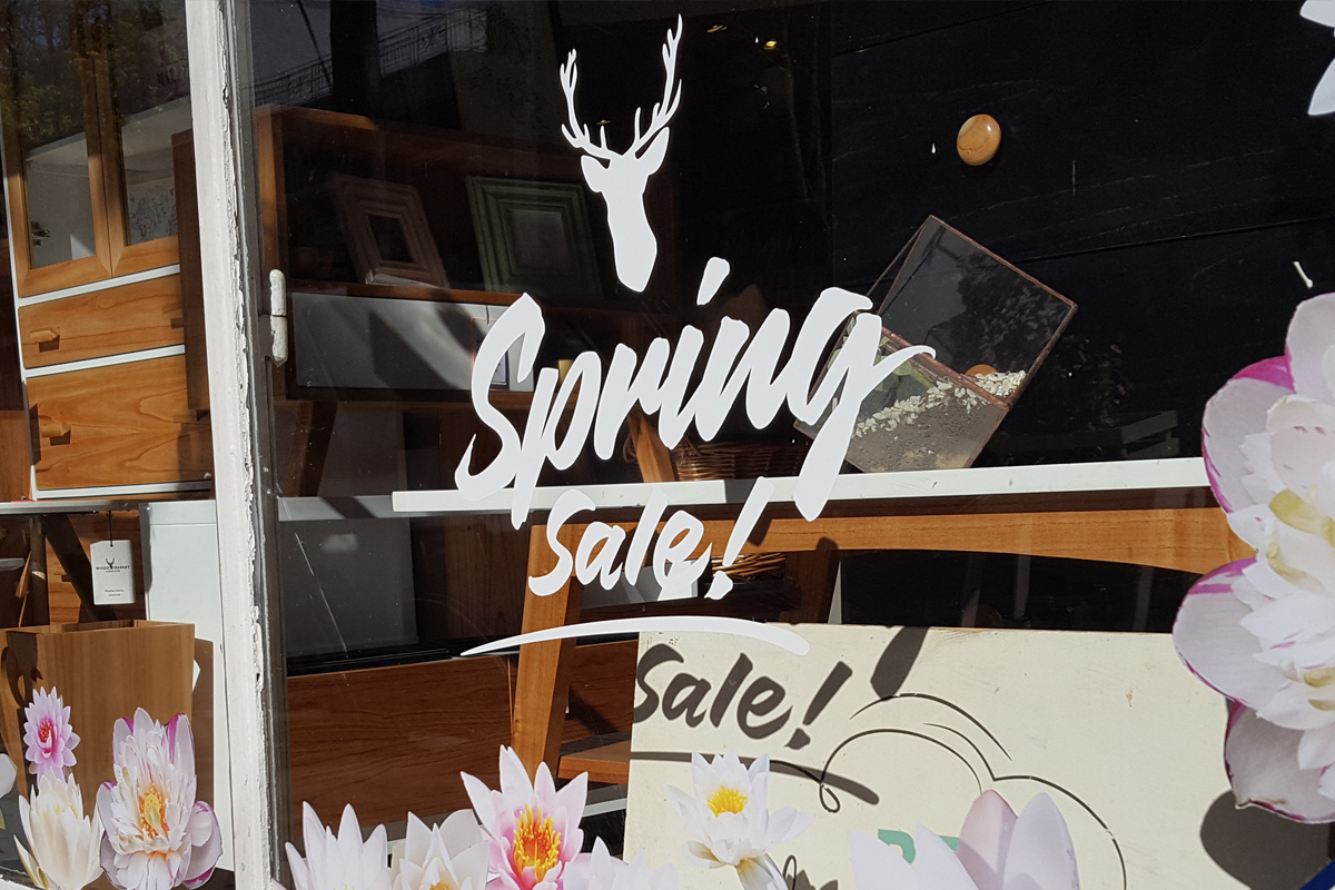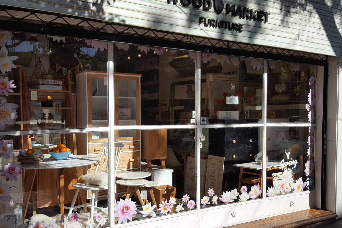 Decoramos la vidriera del local de Wood Market motivo primavera. Acompañando a la marca y la nueva estación.